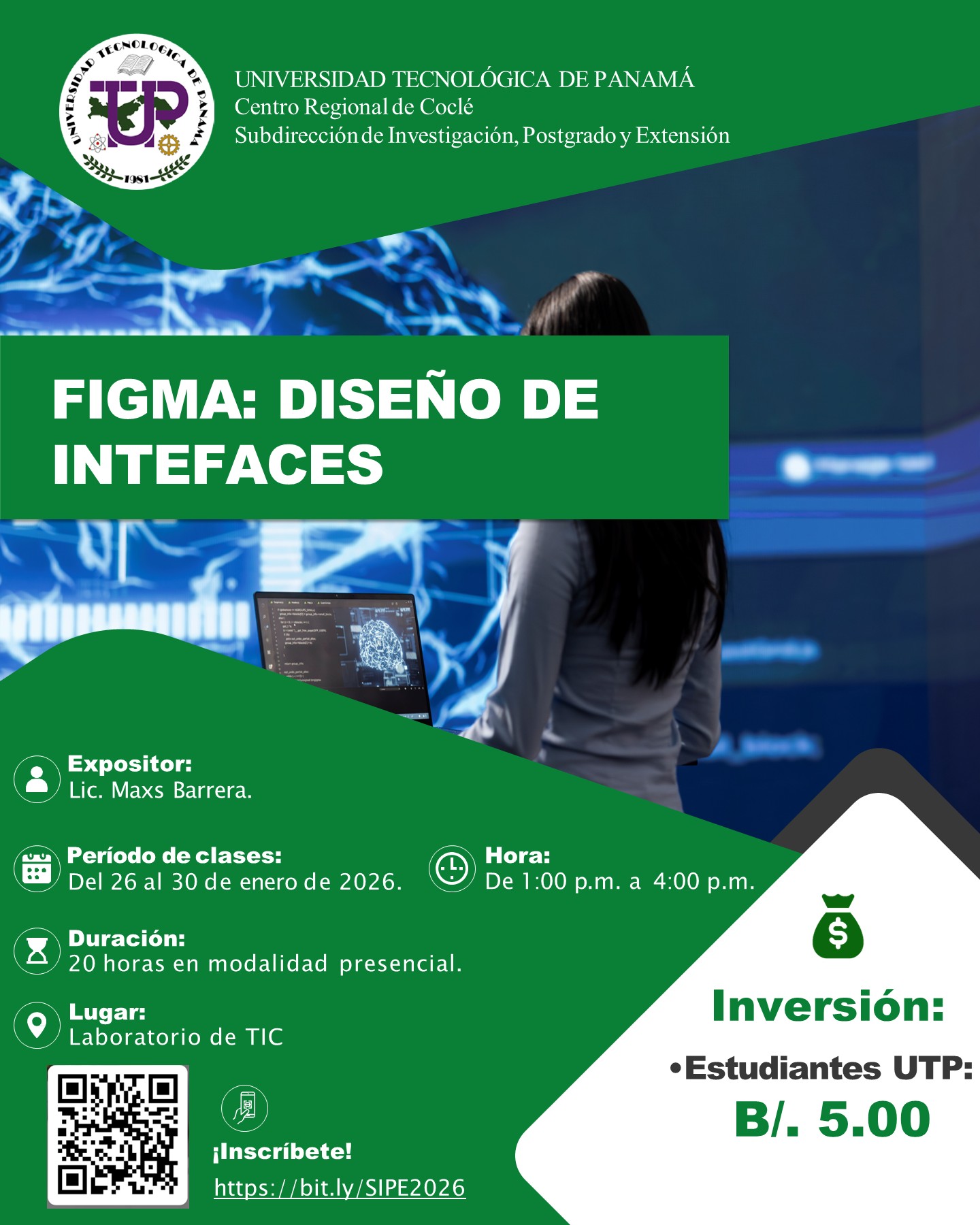La Subdirección de Investigación, Postgrado y Extensión del Centro Regional de Coclé de la Universidad Tecnológica de Panamá anuncia programación de los Cursos de Verano del Receso Académico 2026, a docentes, estudiantes, administrativos, investigadores de la UTP y particulares, según lo establecido en la información de cada curso. Pueden inscribirse en el siguiente enlace: https://bit.ly/SIPE2026, o escaneando el código QR que aparece en los afiches. Los pagos se realizarán en la Caja de la UTP antes de iniciar cada seminario. Para más información escribir al correo: [email protected] o llamar al teléfono: 906-0664 / Ext. 1221