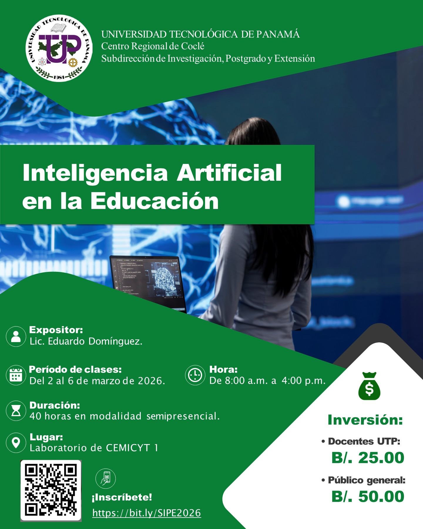 La Subdirección de Investigación, Postgrado y Extensión del Centro Regional de Coclé de la Universidad Tecnológica de Panamá anuncia programación de los Cursos de Verano del Receso Académico 2026, a docentes, estudiantes, administrativos, investigadores de la UTP y particulares, según lo establecido en la información de cada curso. Pueden inscribirse en el siguiente enlace: https://bit.ly/SIPE2026, o escaneando el código QR que aparece en los afiches. Los pagos se realizarán en la Caja de la UTP antes de iniciar cada seminario. Para más información escribir al correo: [email protected] o llamar al teléfono: 906-0664 / Ext. 1221
