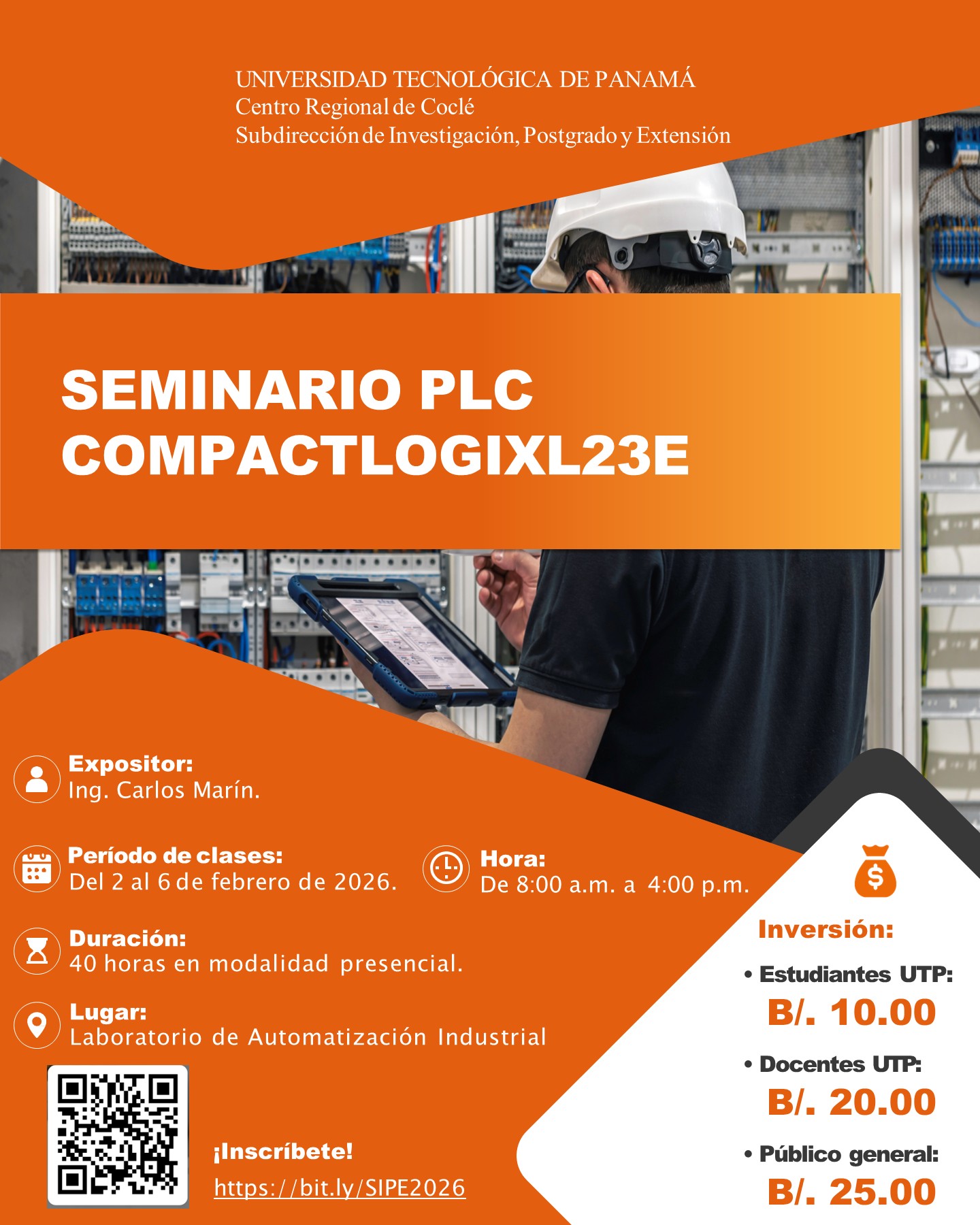 La Subdirección de Investigación, Postgrado y Extensión del Centro Regional de Coclé de la Universidad Tecnológica de Panamá anuncia programación de los Cursos de Verano del Receso Académico 2026, a docentes, estudiantes, administrativos, investigadores de la UTP y particulares, según lo establecido en la información de cada curso. Pueden inscribirse en el siguiente enlace: https://bit.ly/SIPE2026, o escaneando el código QR que aparece en los afiches. Los pagos se realizarán en la Caja de la UTP antes de iniciar cada seminario. Para más información escribir al correo: [email protected] o llamar al teléfono: 906-0664 / Ext. 1221