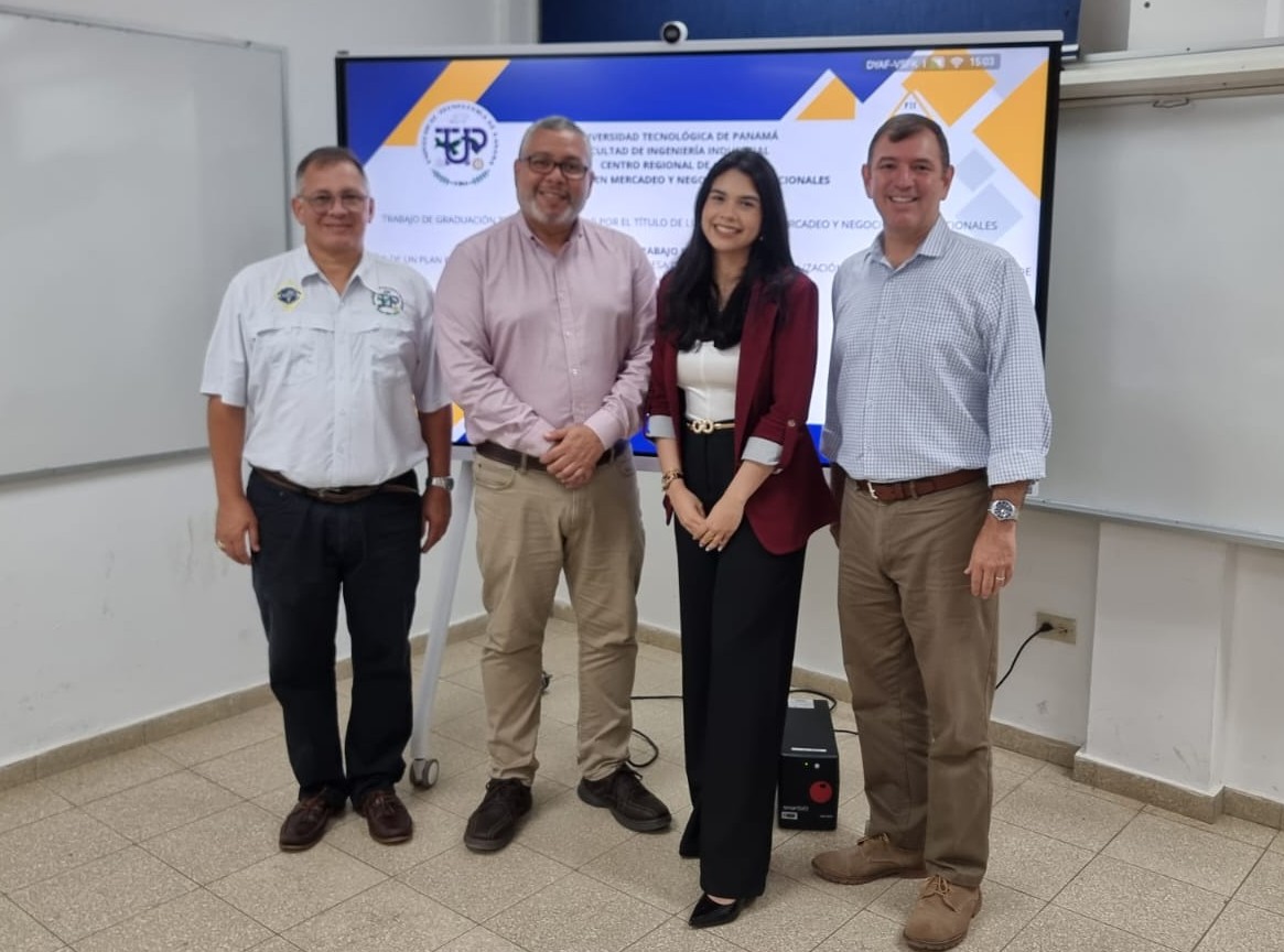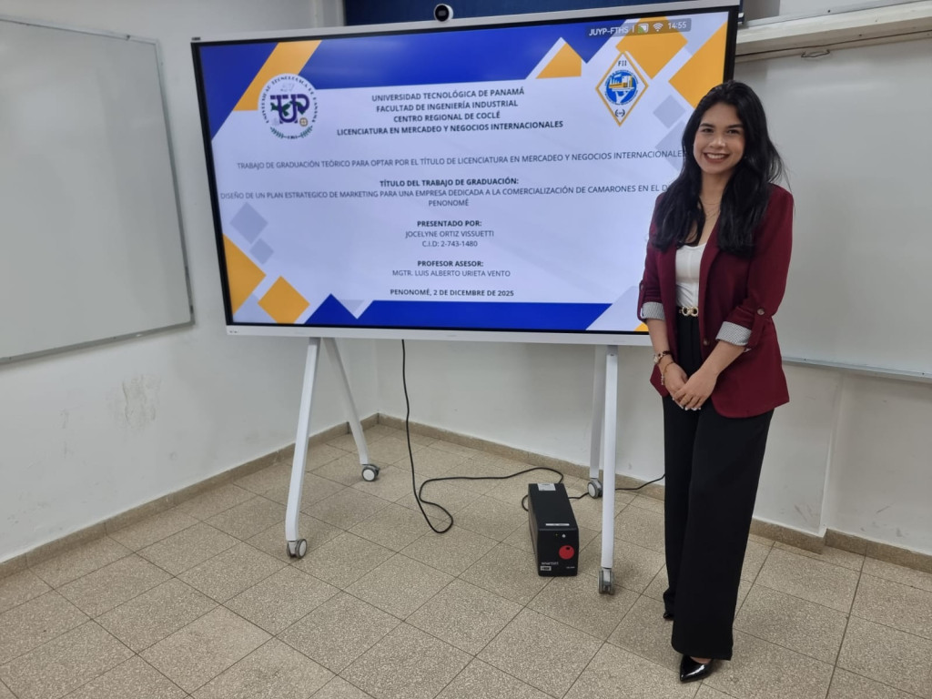 El martes 2 de diciembre de 2025 Jocelyne Ortiz Vissuetti, estudiante de la Licenciatura en Mercadeo y Negocios Internacionales de la Facultad de Ingeniería Industrial (FII) del Centro Regional de la Universidad Tecnológica de Panamá (UTP), en Coclé, presentó con éxito su tesis de investigación titulada: “Diseño de un Plan Estratégico de Marketing para una empresa dedicada a la comercialización de camarones en el distrito de Penonomé”.