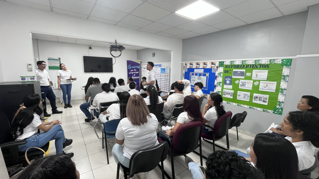 El grupo fue recibido por un equipo profesional conformado por Ing. Fredy Lara, Coordinador Industrial de Producción; Lic. Ninoshka Delgado, Coordinadora de Ingeniería y Empaque; Lic. Ana Serrano, Gestora de Inocuidad; e Ing. Yiseriled Ardila, Coordinadora de Mejora Continua.